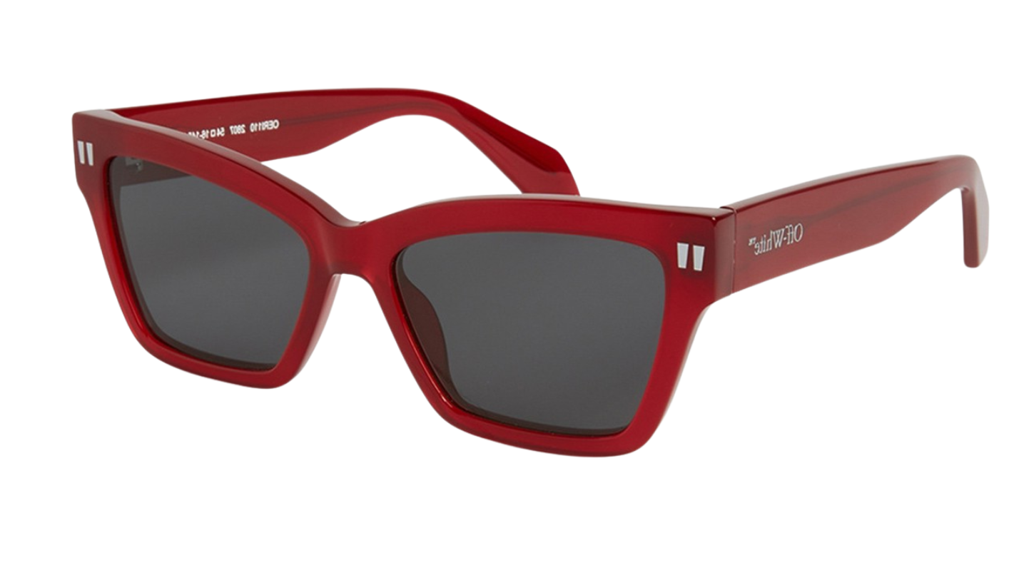 Montura cat-eye en acetato rojo intenso con estética moderna y detalles icónicos de Off-White. Lentes en tono gris oscuro con protección UV, ideales para un look audaz y contemporáneo.