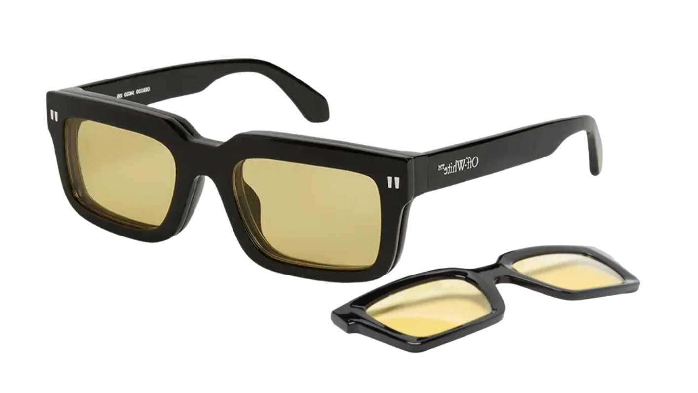 Montura rectangular oversize en acetato negro Off-White estilo vanguardista y urbano. Lentes amarillas con clip-on magnético, look moderno con versatilidad.