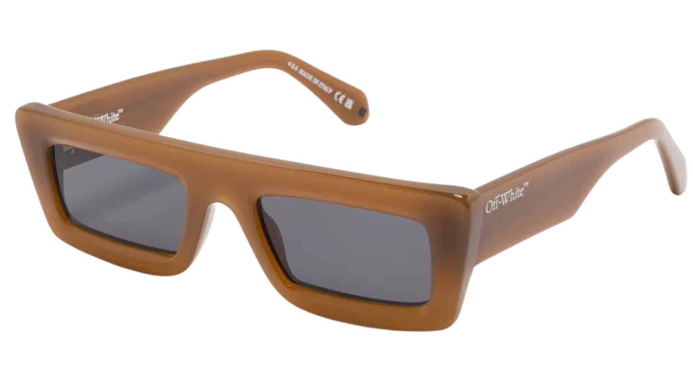 Estilo minimalista con identidad Off-White. Montura rectangular de acetato en tono marrón (café), con letras característico de la marca, combinada con lentes gris oscuro. Protección UV completa para uso diario con estilo urbano.